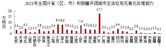 天津、海南、浙江、江西、四川、福建、江苏、山东、云南、安徽、河北、广东、河南、上海、贵州、广西和重庆17个省(区、市)城市生活垃圾焚烧处理能力占比超过60%;湖北、甘肃、吉林、湖南、山西、北京、宁夏、辽宁、黑龙江、新疆和陕西11个省(区、市)在40%-60%之间;内蒙古、西藏、青海3个省(区)和新疆兵团不足40%。