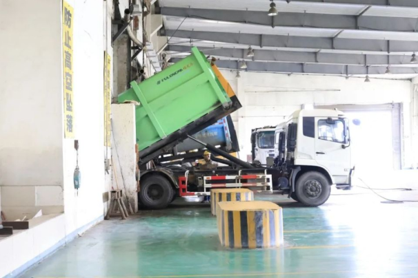 垃圾车在卸料平台上作业