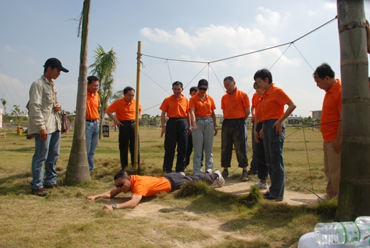 在专业拓展教练的组织和带领下,所有人员分成红黄两队进行训练,在一系列轻松、活泼的准备活动之后,两组队员先后分别进行了“天使之手”、“空中独木桥”、“地雷阵”、“蜘蛛网”和“胜利墙”等训练项目。“天使之手”是两位队员在8米高空中相互携手走过钢丝,“空中独木桥”是每位队员独自走过横在8米高空的钢管,“地雷阵”是每组队员通过集体智慧在10*10的地雷阵中找到唯一的求生通道,“蜘蛛网”是每队队员通过集体协作穿过一组大小不等的绳网,“胜利墙”则是全体人员通过组织、配合和协作徒手攀上4.2米高的水泥墙。每项活动后,教练都组织每队人员畅谈活动心得和感受,让大家能够从活动中得到启发和收获。